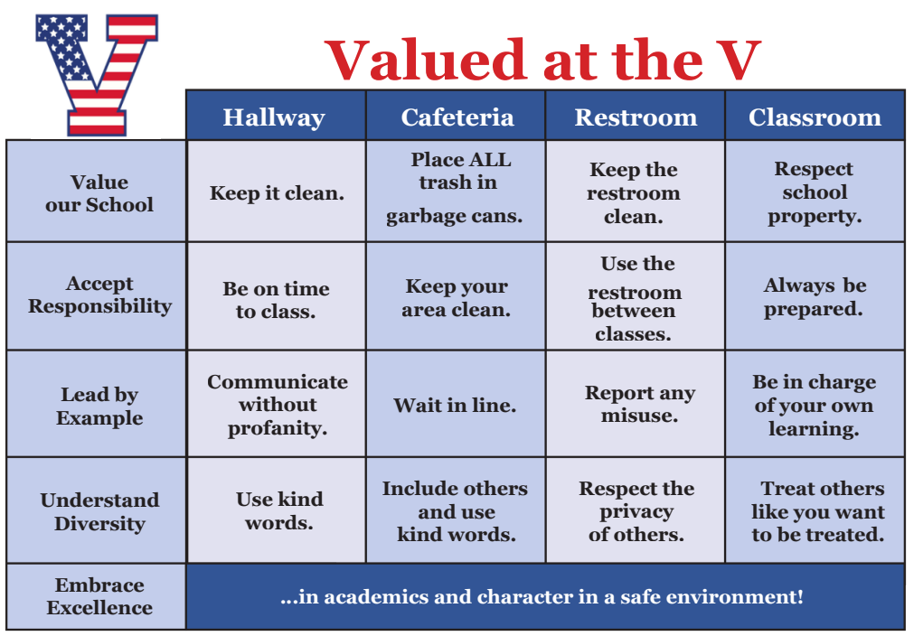 Veterans High School bases its support for PBIS on the "Valued at the V" theme, where the word VALUE represents: